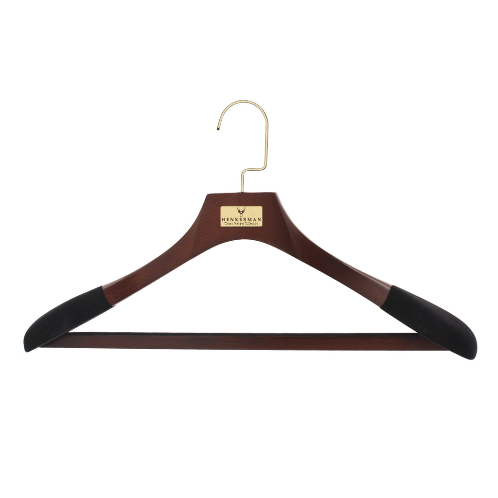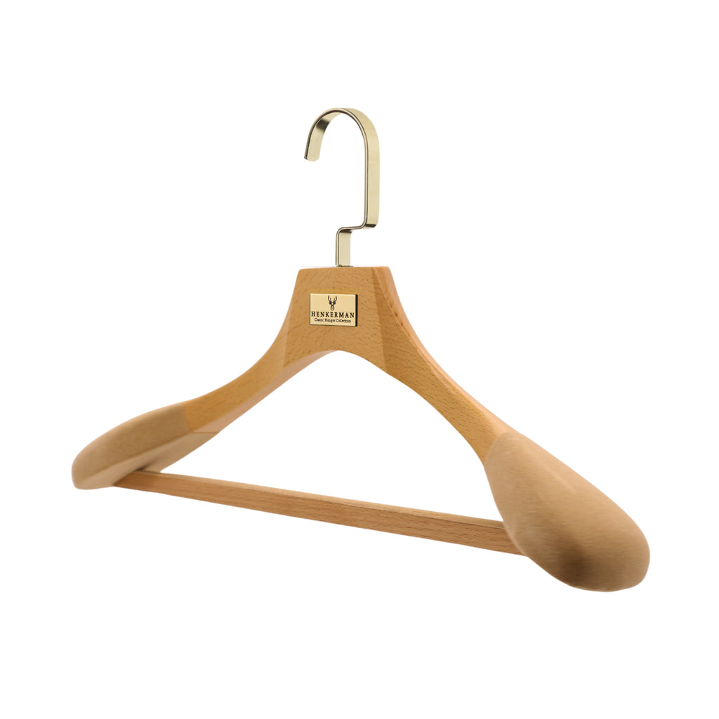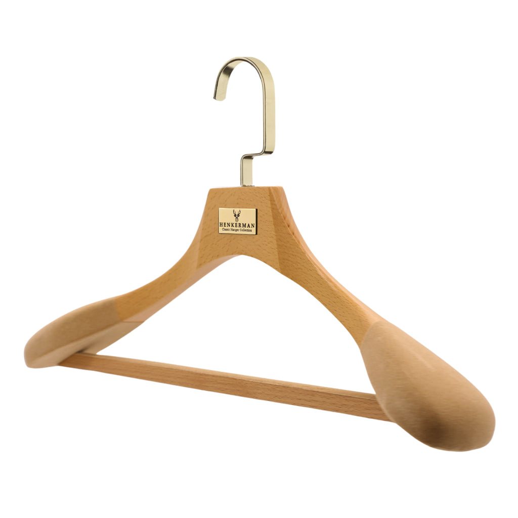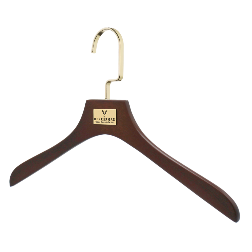 Las perchas de madera de lujo Henkerman® están diseñadas para preservar la forma de las prendas, crear uniformidad en el guardarropa y brindar durabilidad generacional.