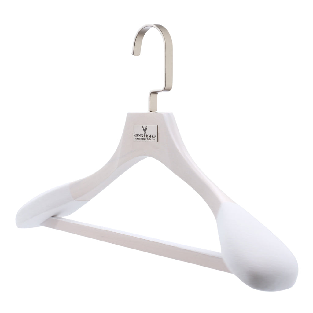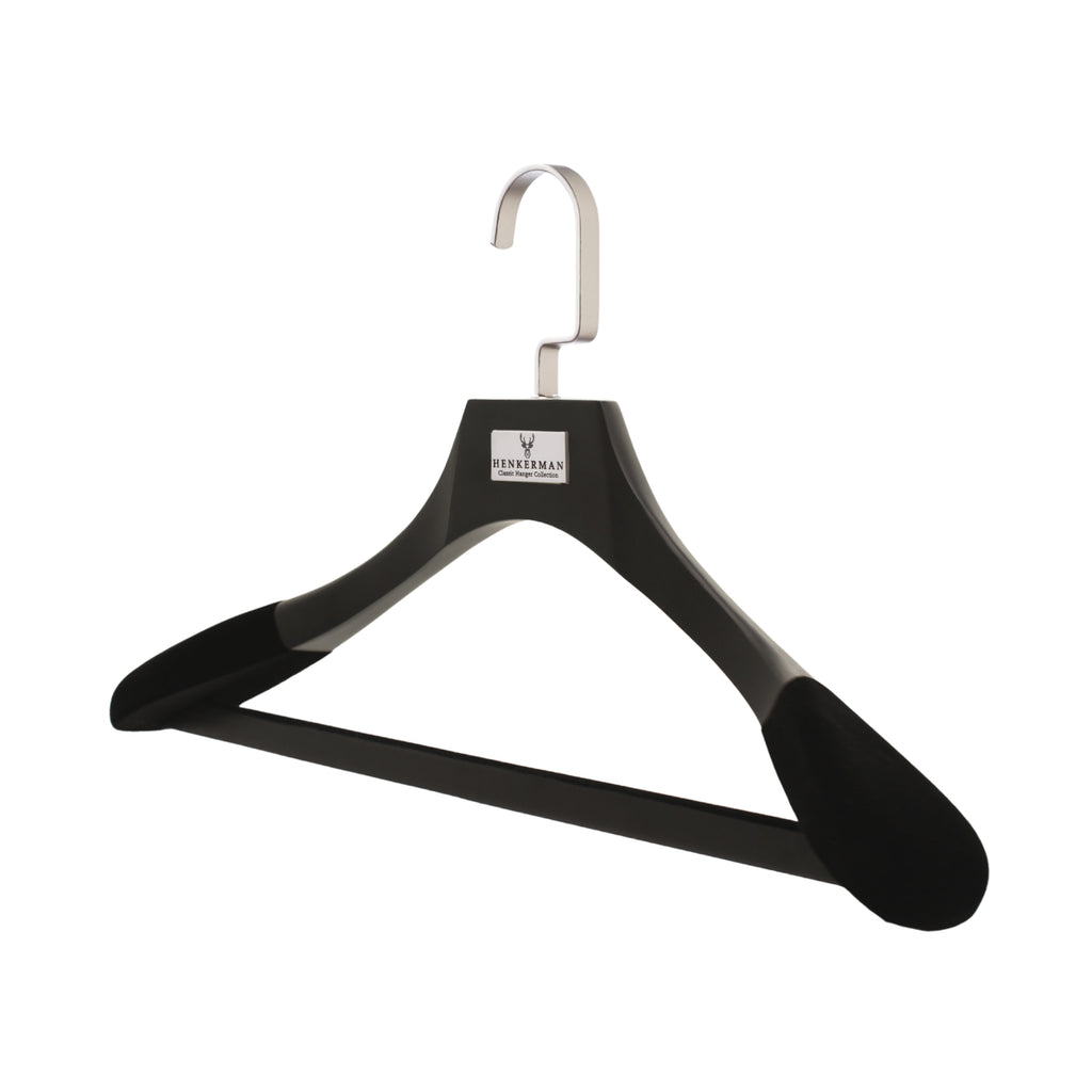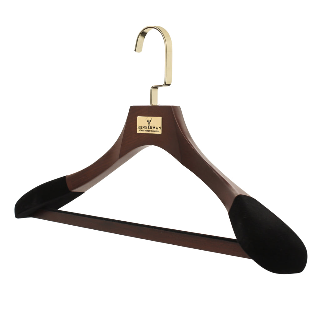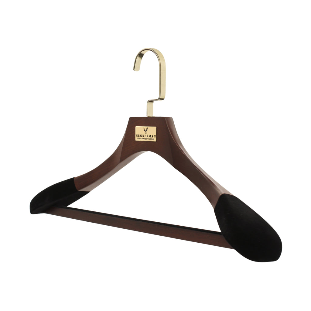 Las perchas de madera de lujo Henkerman® están diseñadas para preservar la forma de las prendas, crear uniformidad en el guardarropa y brindar durabilidad generacional.